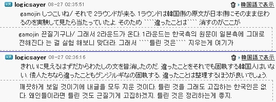 どうやら私がlogicsayerの過去の返信を正確に韓国語で書いたから、ということらしいのですが。