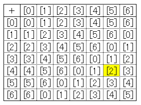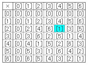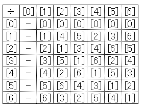 그런데, 나눗셈.통상, 정수의 범위내만으로는 나눗셈을 하는 일은 할 수 없습니다만, 곱셈의[0]을 포함하지 않는 곳을 봐 주세요.각 렬에 반드시[1]이 포함되어 있는군요.이것은,[0]을 제외하는 모든 클래스에 대해, 역수가 존재하는 일을 나타내고 있습니다.