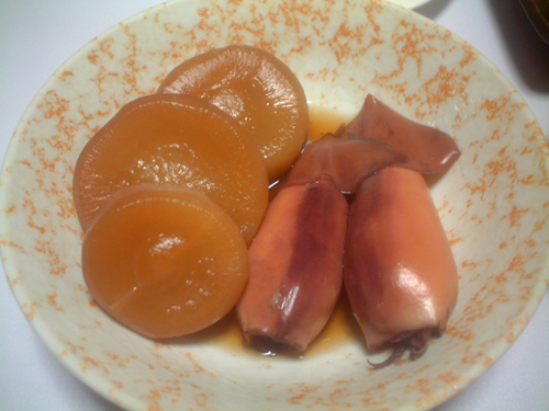水足を抜いたげそを詰め(げそを詰めるとまとまりが良く、形良く煮ることができる)、あらかじめ煮て柔らかくしておいた大根と一緒に醤油、酒、出し汁で30分ほど煮付け、イカがいい感じで縮まったら取り出して、皮を剥く。皮は残しても良いけれど、舌触りが良くないのと破れて見た目が悪くなるのでできれば剥いてしまう。(ここでも料理用歯ブラシ登場ですよ。)