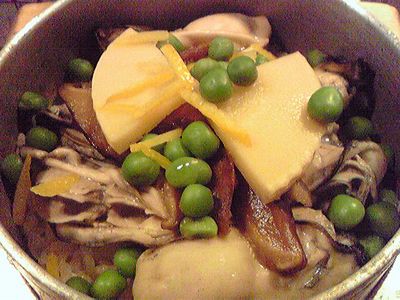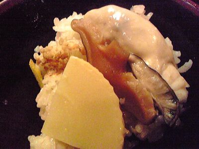 ご夫婦でやっておられる小さい焼き鳥屋さんですが、ランチの釜飯の方が有名かも。五目や蟹などの釜飯の他、冬季は牡蠣釜飯もあります。こちらがその牡蠣釜飯。牡蠣6個、筍、椎茸が入っています。