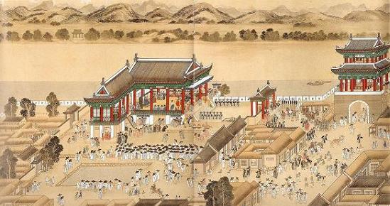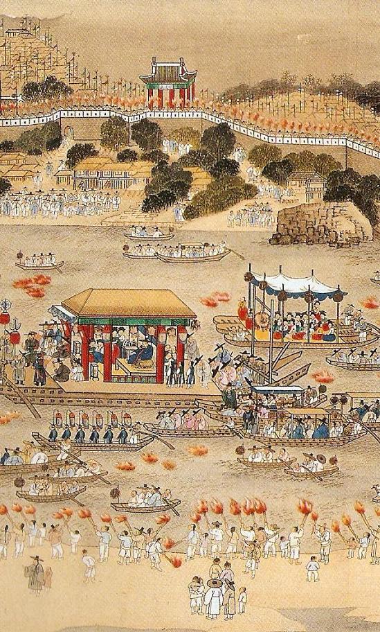 風楽が空を鳴らし帆の船が江を覆った。監司 は′樓船の高いところに座り′多くの首領も多集まり′祝宴が大幅に
