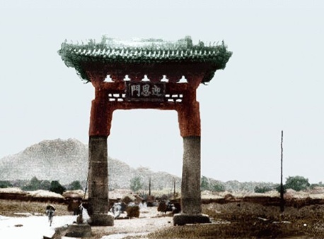 ▲ 1895년 독립문이 세워진 때 부수어진 “영은문”. 여기서 역대 조선 임금은 중국의 사신에게 땅에 무릎을 꿇고 9번 엎드려 절을 했다.