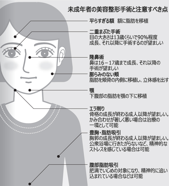 豊胸手術やエラを削る手術は骨格の成長が終わった成人以降に行うことを、医師たちは勧めている。骨を削る手術はその部位の骨の成長を遅らせる可能性があるからだ。