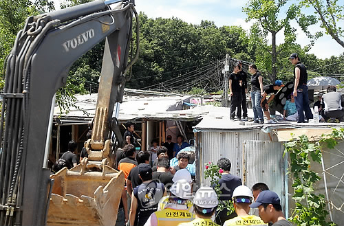 (서 울=연합뉴스) 20년 이상 방치돼왔던 서울의 대표적인 빈민 판자촌인 개포동 구룡마을이 공영개발돼 아파트 2천800가구가 들어선다. 서울시는 강남의 집단 무허가촌인 구룡마을을 공영개발로 정비, 이르면 5년 안에 쾌적한 주거단지로 변모시킬 계획이라고 28일 밝혔다. 사진은 지난해 7월 일부 철거 집행시 구청 철거용역반원들과 주민들이 갈등을 겪고 있는 모습. 2011.4.28 << 연합뉴스 DB >>photo@yna.co.kr