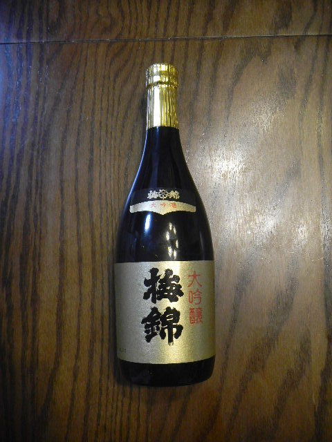 梅錦山川(umenishikiyamakawa)(下の補足説明参照)の、「大吟醸(dai ginjyou)梅錦(umenishi)」と言う日本酒。アルコール(alcohol)度数は、15%から16%と、日本酒としては、標準的。