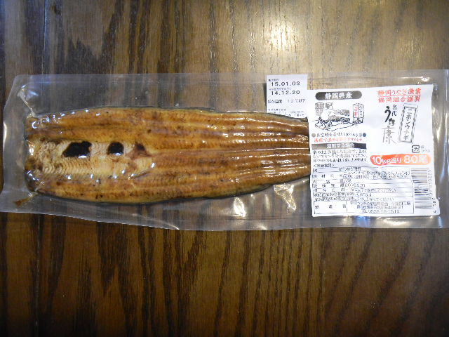日本の、静岡(shizuoka)県(日本の中部地方に位置する県の一つ。鰻の主要な産地となっている)産の、鰻。元々、私が、(我が家で、一人の時に)一人で食べる用に買った物ですが(鰻丼にしようと思っていた)、結局、年末年始に、彼女と食べた物。鰻丼には、しないで、おかず・おつまみの一つとして食べました。