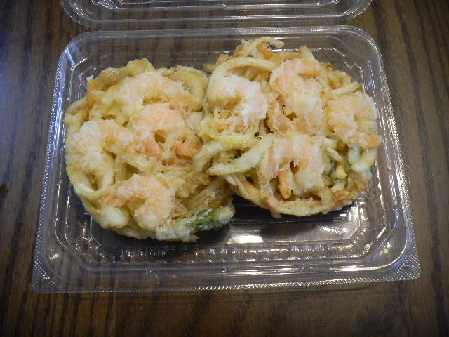 掻き揚げ(kakiage)。掻き揚げ(kakiage)は、天麩羅の一つで、魚介類(seafood)や野菜等を数種類組み合わせ、衣とともに油で揚げた天麩羅です(説明は、wikiを参考にしました)。
