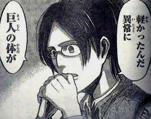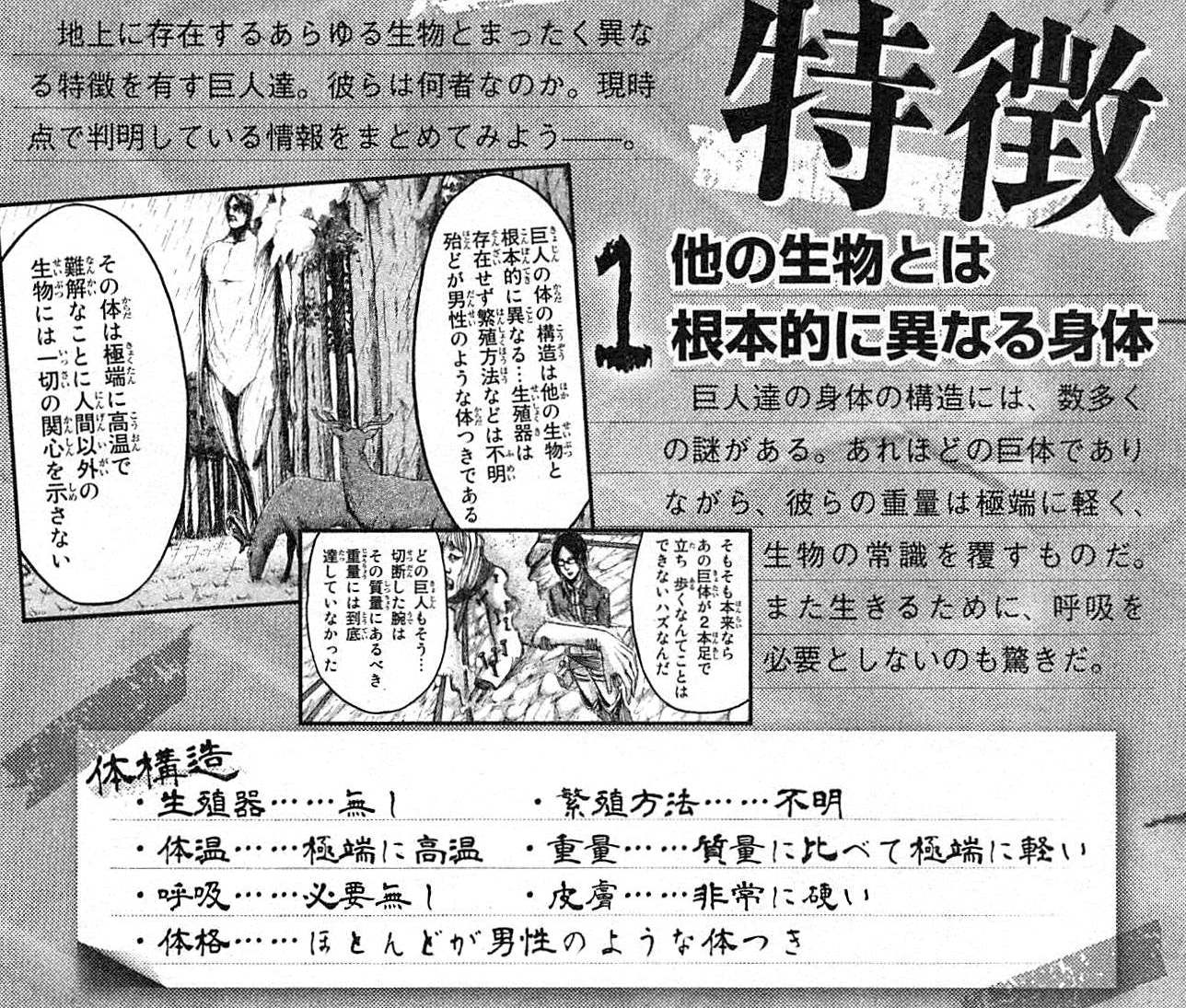 ハンジは巨人の体の軽さを指摘していたが、巨人の戦闘力・破壊力を考えると納得いく説明をすることは不可能と考える。