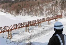 【유우바리】유우바리 슈파로담의 시험담수로 작년 4월에 수몰 한 유바리시 지정 문화재의 삼현다리(삼현 오늘)가, 시험담수의 저수위저하에 수반해 13일에 모습을 나타낸다.1월 하순에는 다리 전체를 볼 수 있게 되어, 3월 하순에 다시 수몰 할 전망.그 이후는 수년에 1도의 갈수기를 제외해 볼 수  없게 된다.