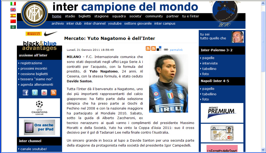 インテルは公式サイト上で、「インテルは長友を心から歓迎します。長友は日本サッカー界で最も重要な人物のひとりで、2008年の北京オリンピック、2010年の南アフリカ・ワールドカップに出場。今年1月のアジアカップではオーストラリアとの決勝戦で李忠成の決勝点をアシストし、かつてインテルの指揮官を務めたアルベルト・ザッケローニの下でアジア王者のタイトルを獲得しています」と、長友を歓迎するコメントを記載。
