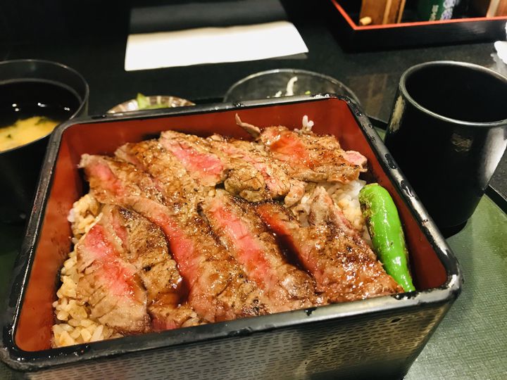 阪急梅田駅直結の三番街地下2階にある肉のお店です。店内はモダンで洒落た空間でカウンター席のみのこぢんまりとしたお店です。牛鍋や特撰和牛ロース鍋が人気とのことですが、丼や重も外せない。ということで今回はステーキ重930円を注文。もっとたくさん食べたい方は肉大盛りで、御飯も大盛りにできます。ステーキは、ちょうど食べやすい細さにカットされています。お肉はミディアムレアなので、程よい柔らかさが嬉しい。甘めのタレがご飯との相性も抜群で、美味しすぎる逸品。ご飯の量は一般的な重に比べ多めなので、お腹いっぱいになりました。幸せな時間でした。