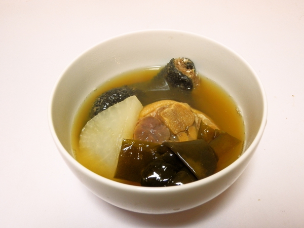 イラブーと豚足、大根、昆布を醤油少々を加えた塩汁で煮込むだけなんですけどね。ええ、下ゆでした後は時短で圧力鍋。ガチガチに硬いので、圧力鍋でも時間がかかる。しかも、もの凄い量のアクが出るので、スープはキッチンペーバーで漉した方がいいかも。