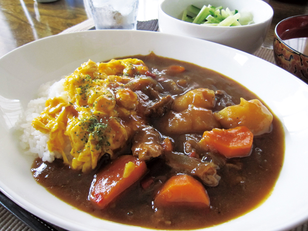 豚薄切り・じゃが芋・玉葱・人参の昭和のカレーにスクランブルエッグを加えたり。