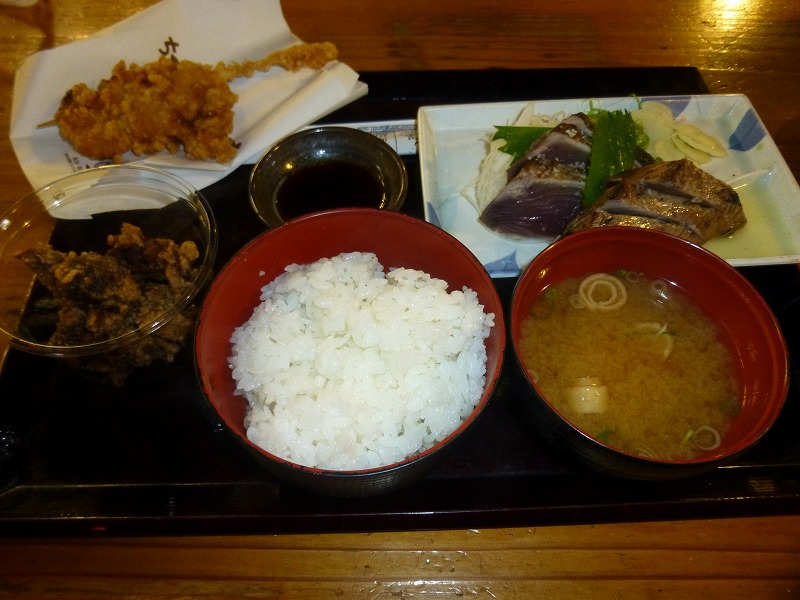 かつおの塩たたき定食、クジラの竜田揚げ、から揚げ