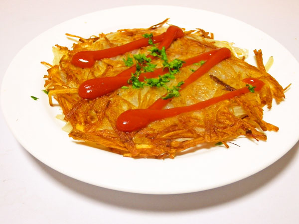 2 じゃがいもの千切りに軽く塩をして、4割ほどの量をフライパンに丸く広げ、少量の油を使ってライ返しで押しつぶしながら焼いてジャガイモ同士をくっつけ、煎餅状にする(じゃがいもは水にさらさなければ、油で焼くと澱粉が糊になってお互いにくっつく)。