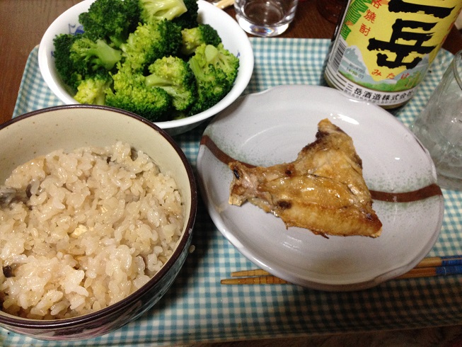 冷凍保存しておいた炊き込み御飯とブリカマの塩焼きと茹でたブロッコリーで晩酌♪(´ー`)