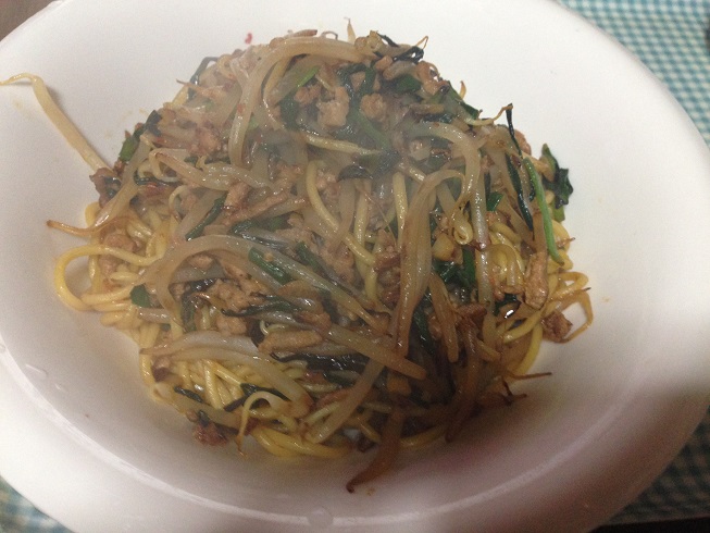 もやし・ニラ・豚ミンチを豆板醤・甜麺醤等々で味付けした、中華風焼きそば。
