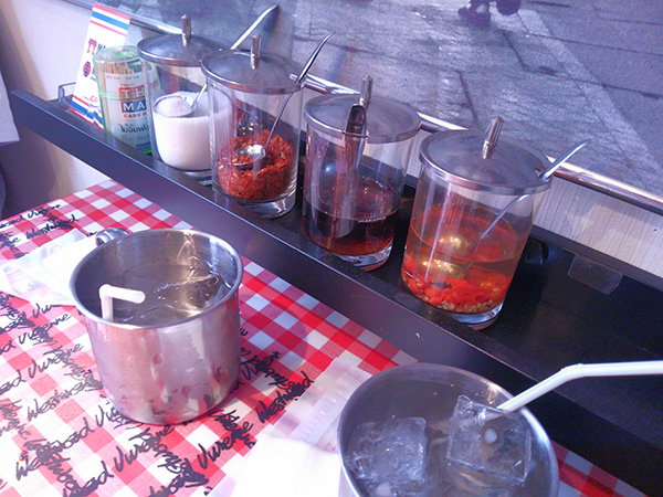 테이블 마다, 타이 항례의 조미료가 놓여져 있습니다.