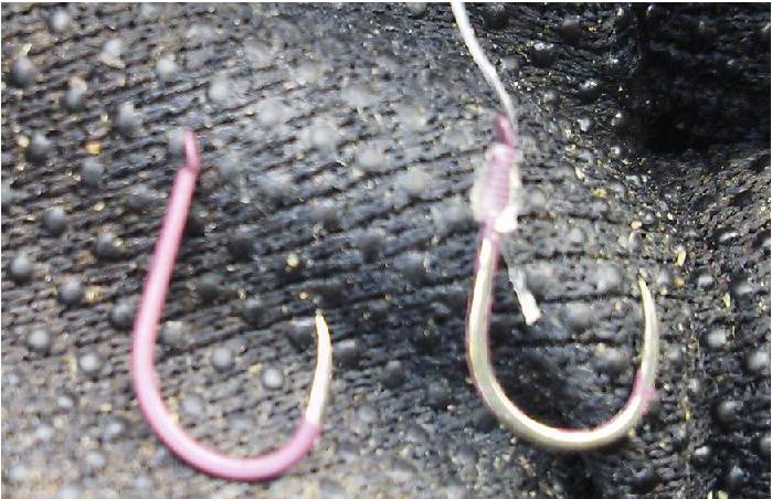 左側の針は卸したてのもの、右側のハリスが結んであるものは何回か使用したものす。