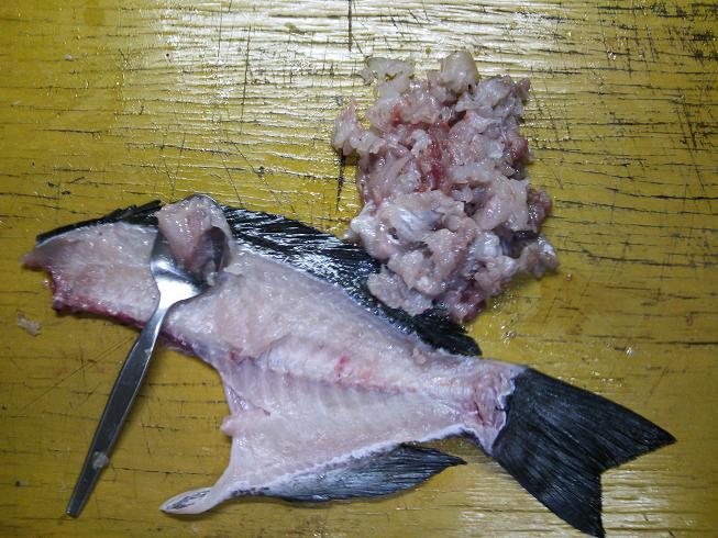 骨や皮に残った身を骨が入らないよう注意しながらスプーンでこし取り・・・、