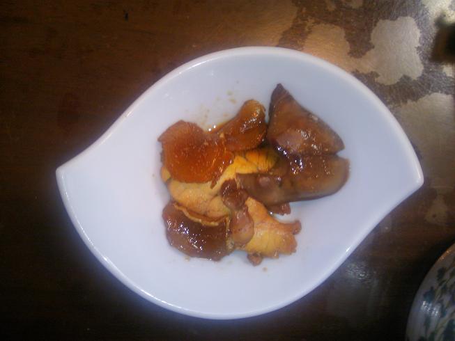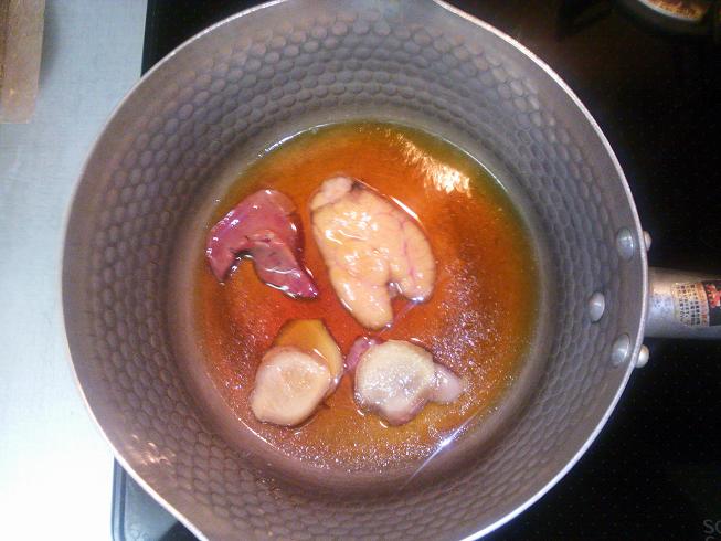 卵、肝、胃袋(内容物を取り除きよく洗ったもの)は、生姜、酒、砂糖、醤油、めんつゆで煮付けてみました。