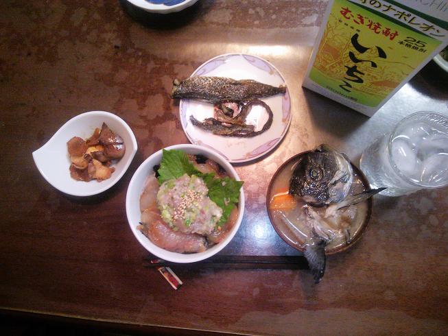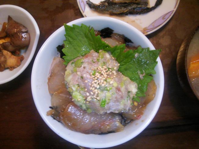刺身は、生姜、酒、醤油のタレにつけ1時間程度冷蔵庫に寝かせヅケにしました。