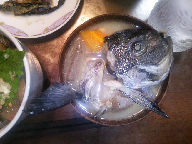 アラはよく煮出し、大根・ニンジン・コンニャク・ゴボウ・タマネギ等の野菜を入れ味噌で味付ただけのアラ汁