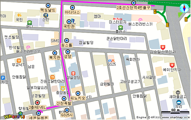 -신천족발과 GS25시 사이 먹자골목 50m 2F REVEL (1층 석쇠한판)