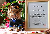 マロンは、委託駅員の飼い主に付き添っている姿が「かわいい」と評判を呼び、IGRが昨年6月に名誉駅長に任命。全国から観光客が訪れる人気となり、今年6月には任命1周年を記念したグッズも発売された。