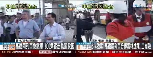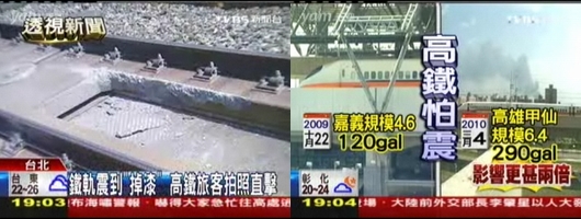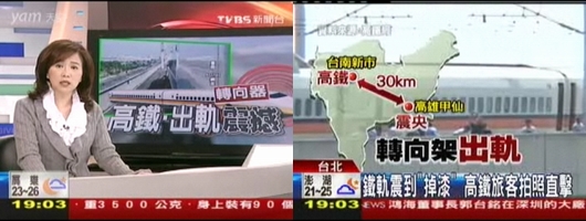 일본제의 「700 T형」이 달리는 대만고속철도에서는 합계 7개의 열차가 긴급정지했다.그 중 1개는 300 km/h로 대남역 부근을 주행중에 차체를 지탱하는 부분 1개가 탈선했다.