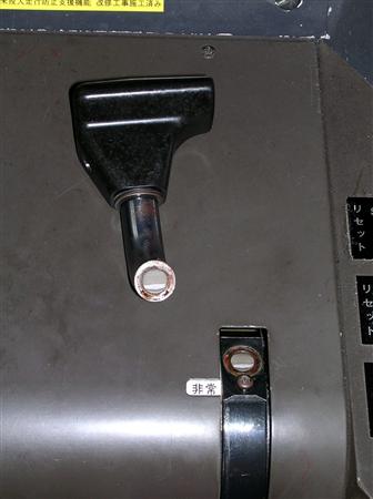 JR서일본에 의하면, 브레이크 레버는 철제의 정자형으로 근원의 직경이 약 2센치, 밑으로부터 손잡이까지는 약 15센치.발차시키기 위해 브레이크를 느슨하게했을 때에 접혔다고 보여진다.