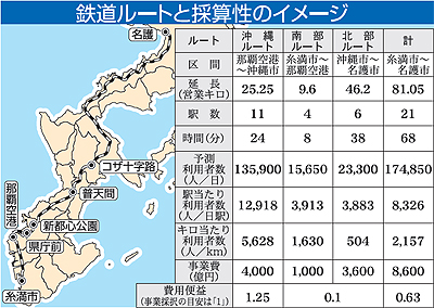 一方、那覇~沖縄市までの区間(約26キロ)では、総事業費約4000億円。費用便益比は1・25だった。ただ、いずれも現行制度では建設費が膨大で運行会社の負担が大きいため事業化は困難。