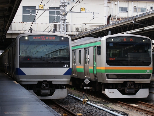 우에노역(도쿄도 타이토구)에 줄선 미토 지사 카츠타 차량 센터 소속의 「E531계」(왼쪽)과 오미야 지사 코야마 차량 센터 소속의 「E231계 근교형」( 오른쪽).