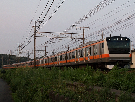 황혼시에 중앙선의 히노역-토요타역(도쿄도 히노시)을 달리는 하치오지 지사 토요타 차량 센터 소속의 「E233계 통근형 0 접수대」.