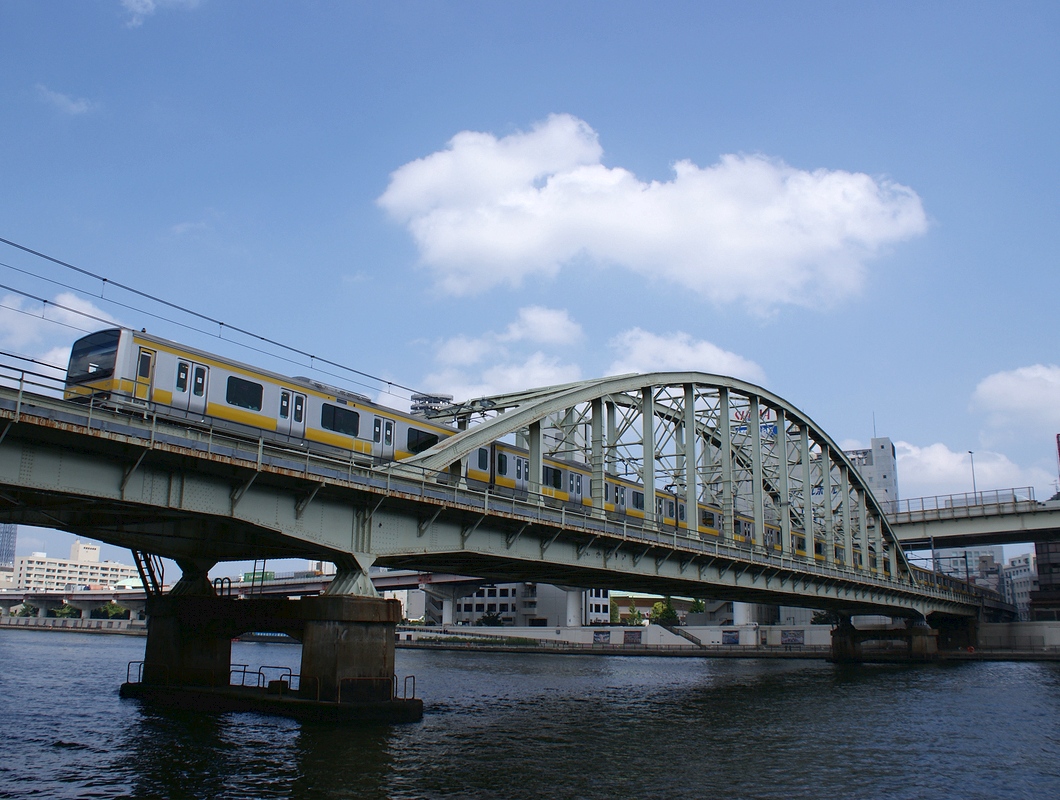 료고쿠역(도쿄도 스미다구)-아사쿠사바시역(도쿄도 타이토구) 사이에 설치된 소부선 스미다강 교량을 건너는 하치오지 지사 미타카 차량 센터 소속의 E231계 통근형 0 접수대.