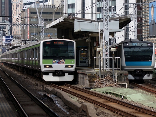 유라쿠쵸역(도쿄도 치요다구)에 동시착한 도쿄 지사 도쿄 종합 차량 센터 소속의 「E231계 통근형 500 접수대」(왼쪽)과 오미야 지사 우라와 전철구 소속의 「E233계 통근형 1000 접수대」( 오른쪽).