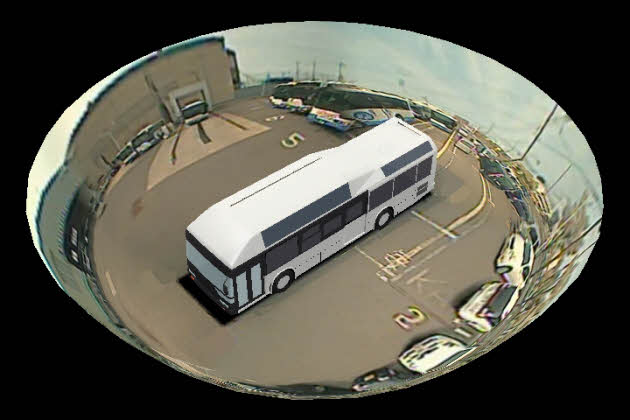 車両周辺監視システム「マルチアングルビジョン」は,さまざまな視点から立体的な俯瞰映像を表示できるシステムである。富士通グループが開発を手掛けており,2010年5月にはトヨタ自動車向けオプションとして発売済み。今回ソラビに向けて,バス用システムを新たに開発した。