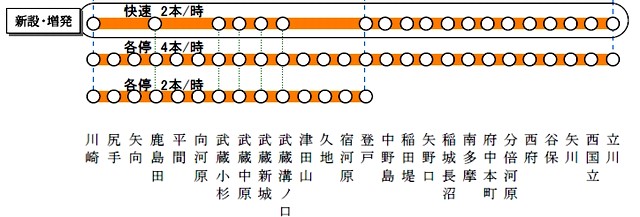 난부선은 2011년 3월부터 일중에 쾌속 운전을 개시한다.무사시 코스기역을 10시 - 15시에 발착하는 쾌속 열차를 30분 두어에 운행한다.쾌속 열차의 정차역은 카와사키・카시마다・무사시 코스기・무사시 나카하라・무사시 신성・무사시 미조노쿠치・노보리토.노보리토 - 타치카와간은 각 역에 정차한다.또, 일부 열차의 운전 구간을 연장한다라는 것.