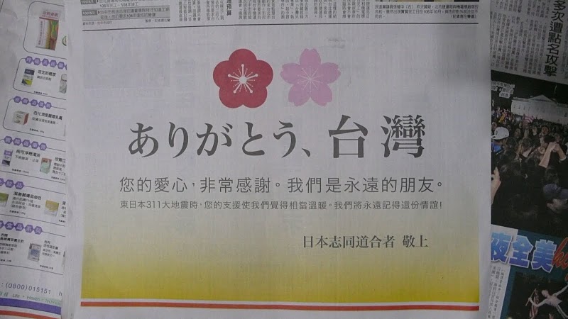 3월 11일의 대지진이 발생하면, 대만인은 내몸와 같이 움직였다.400톤의 구호 물자를 맨 먼저에 보냈던 것도 대만이었다. 여야당의 국회 의원과 함께 하루 분의 봉급을 기부한 마 영9 총통은 스스로 텔레비젼의 모금 생방송에 출연해, 일본 지원을 호소했다. 대만 CTS 방송이 진행한 생방송에는 100명 남짓의 연예인이 참가해, 4시간에 7억 8000만 대만 달러의 기부금이 모였다. 결혼 축하금 전액을 기부한 배우도 있었다. 대만 정부의 집계에 의하면, 이번 달 12일 현재의 기부금은 40억 1000만 대만 달러로, 중 91%의 36억 5700만 대만 달러는 일반인이 적십자 등 9 민간 단체를 통해 냈다.