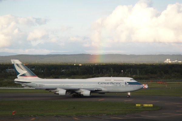 中途半端に架かる虹の手前を進むCATHAY PACIFICのジャンボ機。