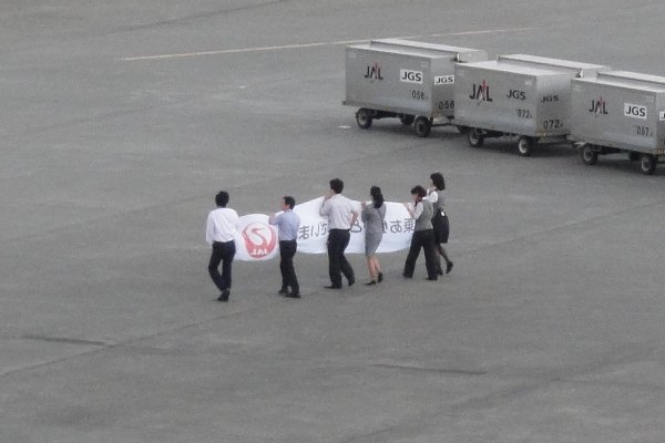 そうやって離陸したり着陸してる飛行機を ( ゜д゜)ボヘー と眺めていると、手前の方で数人の人が横断幕の様な物を持って出てきましたよ。