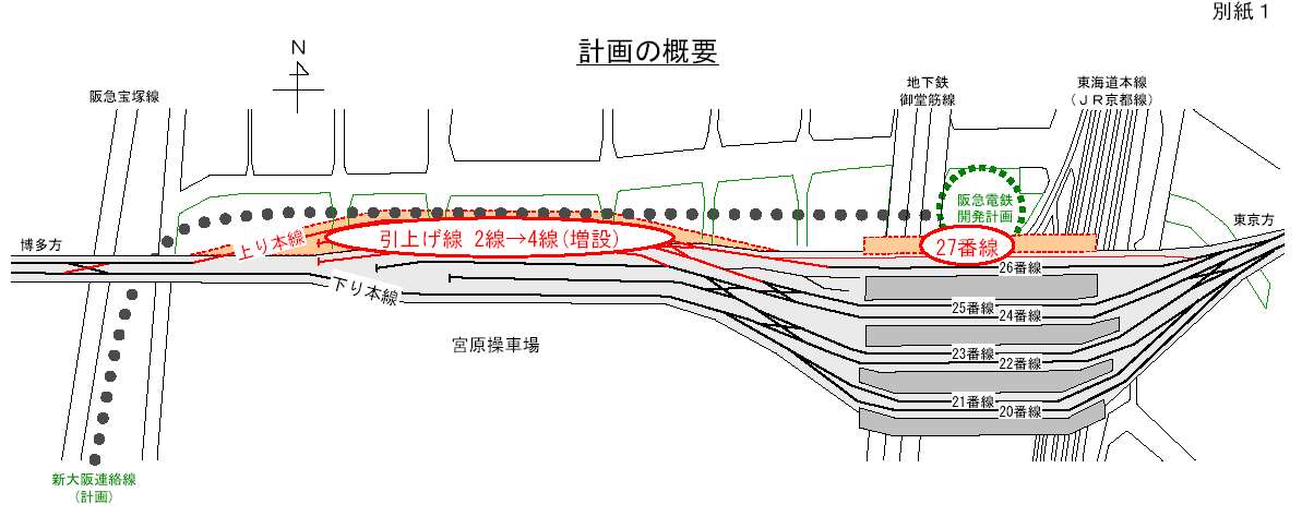 토카이도 신간선의 역 홈 증설은 구국철 시대에 신오사카역에서 20 번선을 추가한 쇼와 60년 이래로, 동사 발족 후는 처음.동역이 토카이도 신간선과 직통 운전하는 산요신칸센의 시발역이기도 하기 때문에, 신홈에서 갯수증가나 재해시의 다이어 조기 복구 등에 대응한다.