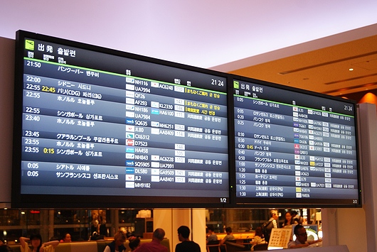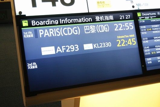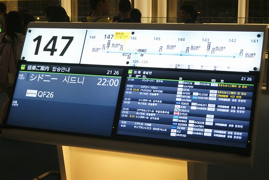 ピン・ポン・パン・ポーン♪「スカイチームメンバーKorean Airよりご案内致します。ソウル(金浦)行19:55発Korean Air 2710便ならびに日本航空5237便は、ただ今の時刻をもちましてご搭乗手続きを終了させていただきます。当便にてソウル(金浦)へご出発で、まだご搭乗手続きをお済ませでないお客様は、お急ぎKorean Airチェックインカウンターまでお越しください。」
