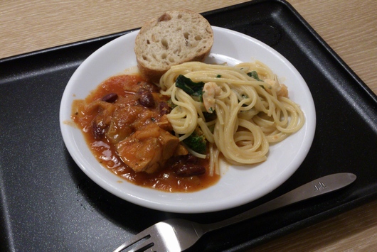 豚肉のトマト煮込み、ほうれん草とエビのクリームパスタ、メゾンカイザーのパンを頂きます。お馴染みのビーフカレーや点心、お味噌汁やサラダ、フルーツもありますよ。