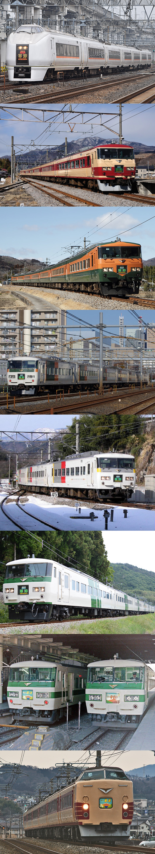 국철 시대부터 계속 달리는 특급「쿠사츠 」.그 활약의 장소가 좁아지는 것과 동시에, 다카사키선이나 죠에츠선을 가는 차량도 세대 교대 한다.도심과 마에바시등을 묶는「아카기」계통의 차량은, JR화 후에 등장한 651계에 모두 통일되어“국철 마지막 특급 차량”인 185계가, 토호쿠・다카사키선 방면의 정기 운용으로부터 빗나간다.