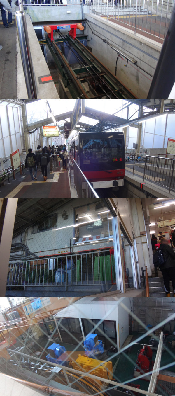 見上げると、ケーブルカーの運転室とケーブルの巻き上げ機。ケーブルカーって、車内でなくて外で運転してるんだものねぇ。