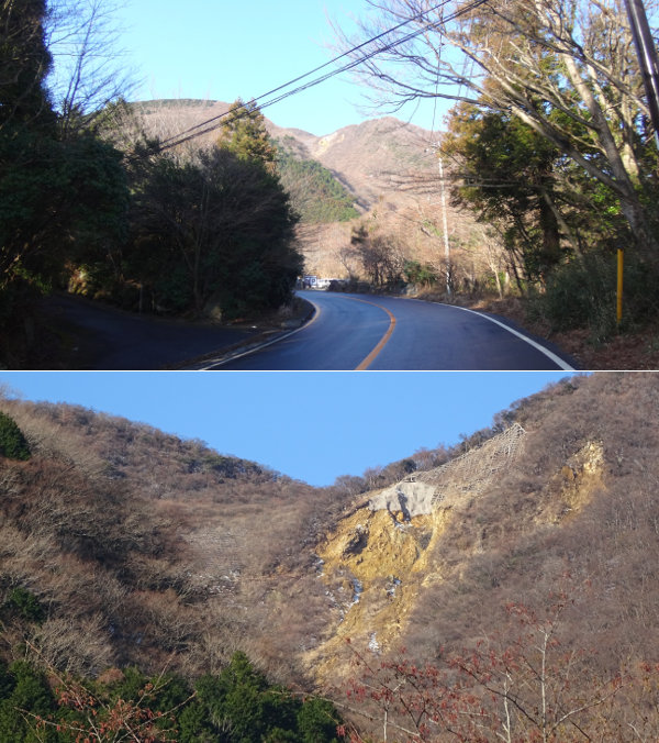 멀리 보인 산정부.잘 보면, 법면 보강 공사를 한 곳(점)이 법면 붕괴하고 있는 느낌.