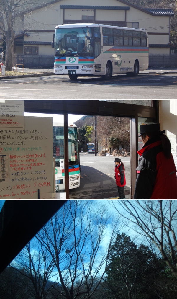 強羅の駅に着いて、登山電車のホームで次の列車が来るのを待っていると、踏切の側でバスが妙な動きをしているのが見えましたよ。