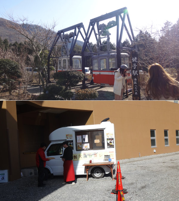 駅前で代行バスを待っていると、「特製大涌谷カレー」なんてのが店を開いていましたよ。カレー一杯500円ですか。
