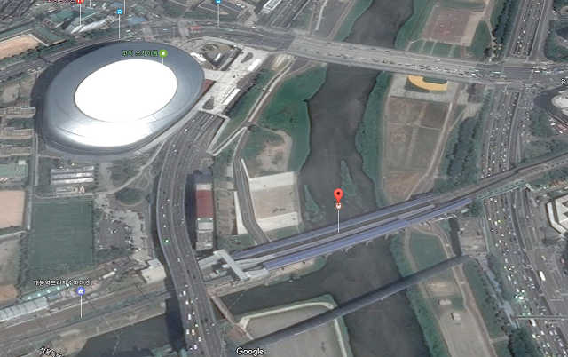 ここは韓国最初のドーム球場の最寄り駅で、川の上にかかる橋の駅だ。